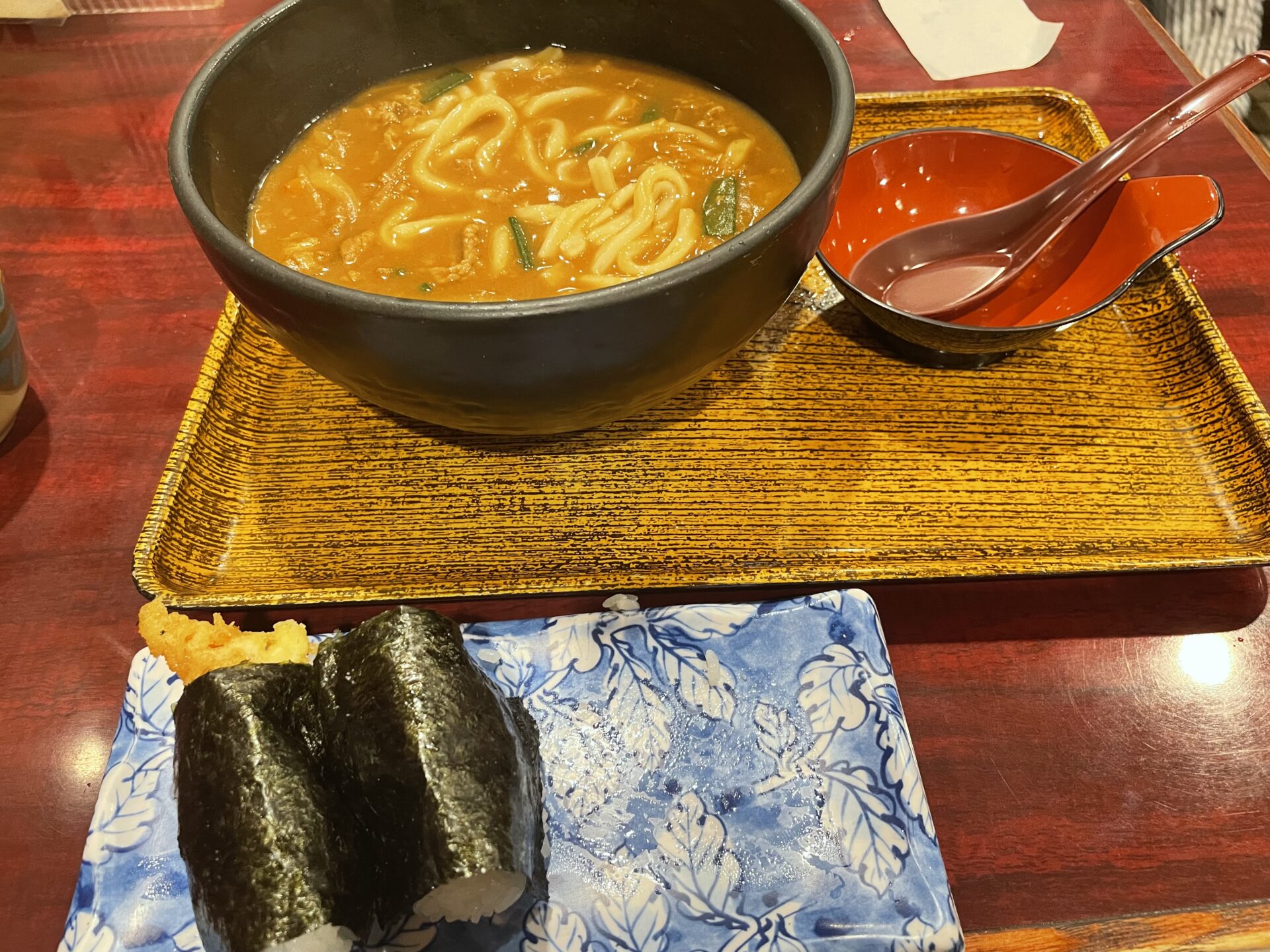 以前、掲載した写真で申し訳けありませんが、奥がカレーうどん、手前が天むす。
