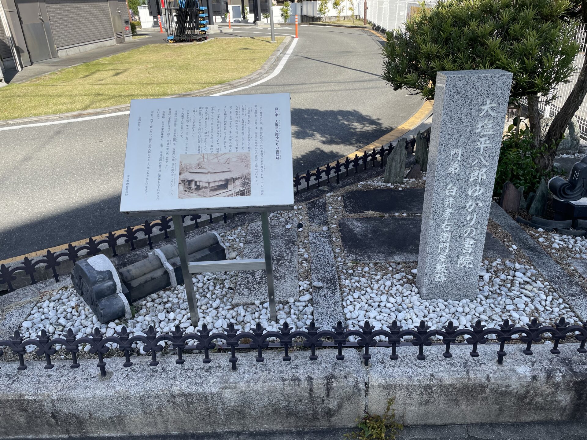 文禄堤の終わり(国道1号線にそってより京都より)が見えてくるとマクドがあります。そのマクドの敷地内に大塩平八郎ゆかりの書院という解説板があります。