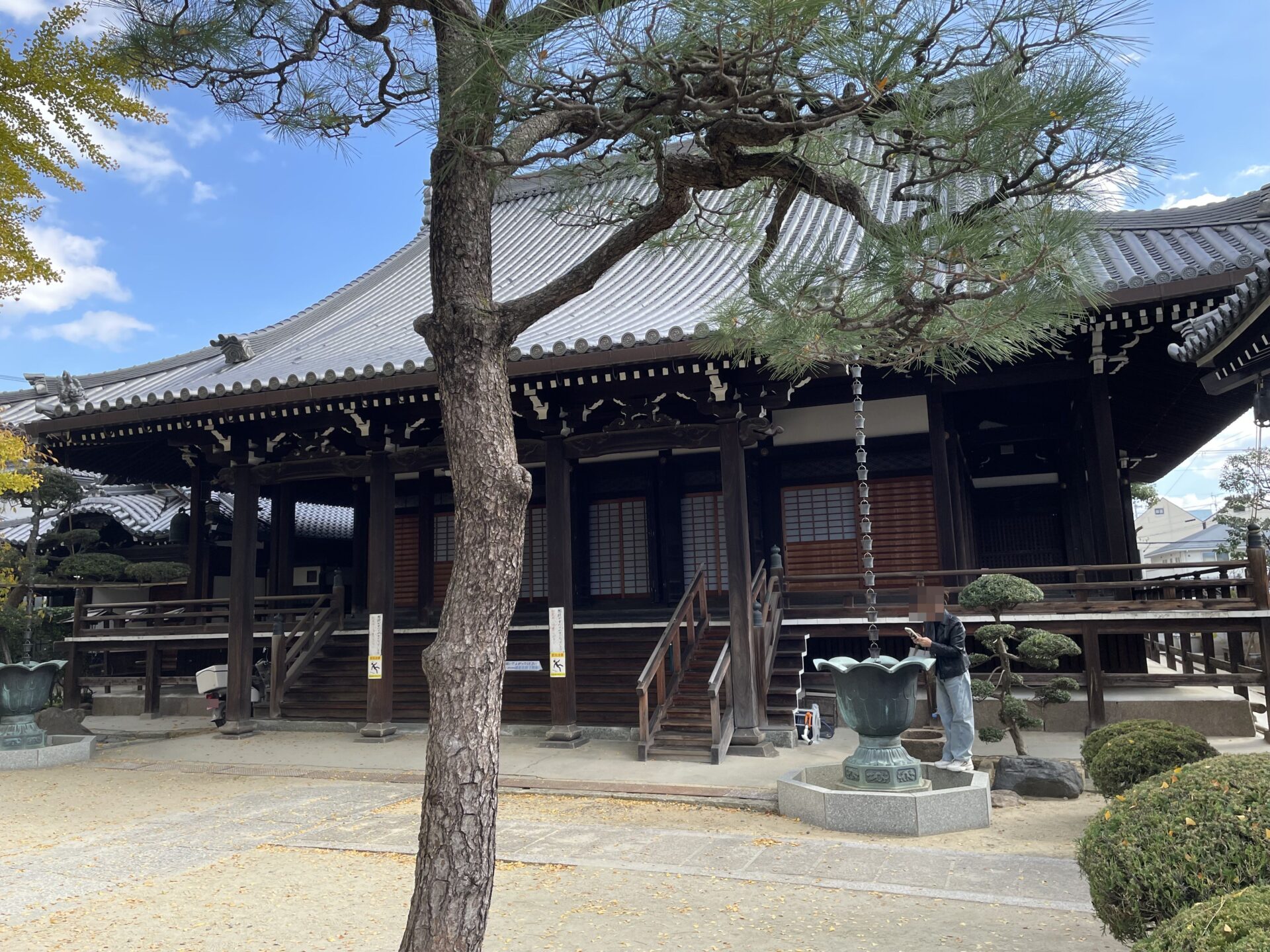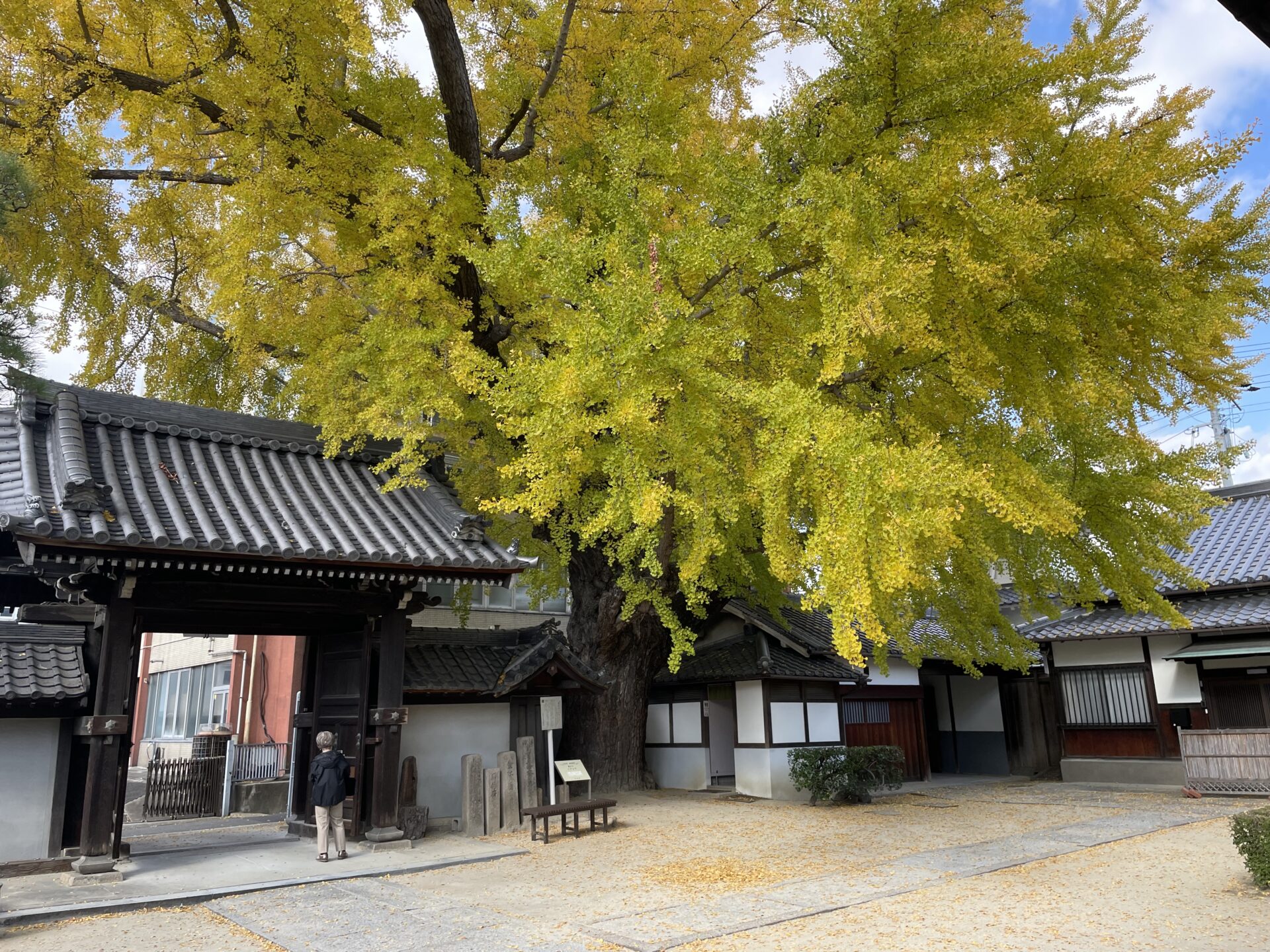 このお寺は河内、大和、和泉、摂津で布教活動を行っていた蓮如上人の勧めで建てられました。創建は1477年、浄土真宗西本願寺派、本尊は阿弥陀如来です。いちょうの木が有名ですね。